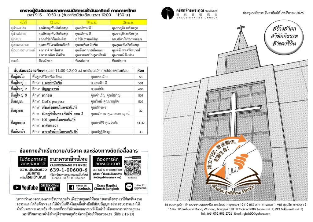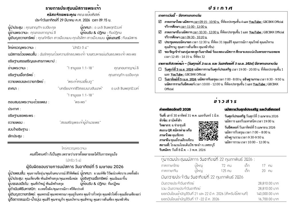 สูจิบัตร : ประชุมนมัสการ วันอาทิตย์ที่ 29 มีนาคม ค.ศ. 2026