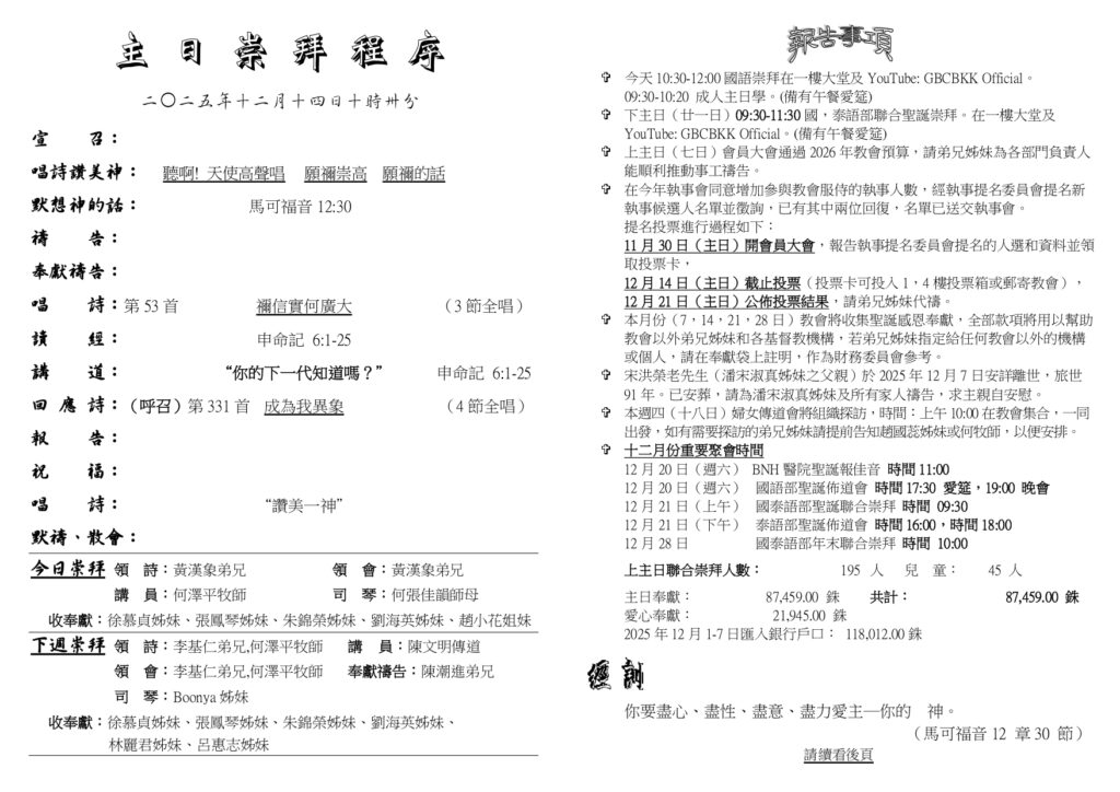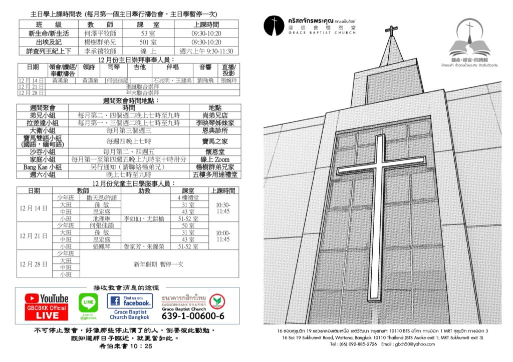 10:30-12:00國語崇拜在一樓大堂及YouTube: GBCBKK Official。09:30-10:20 成人主日學。