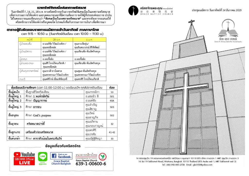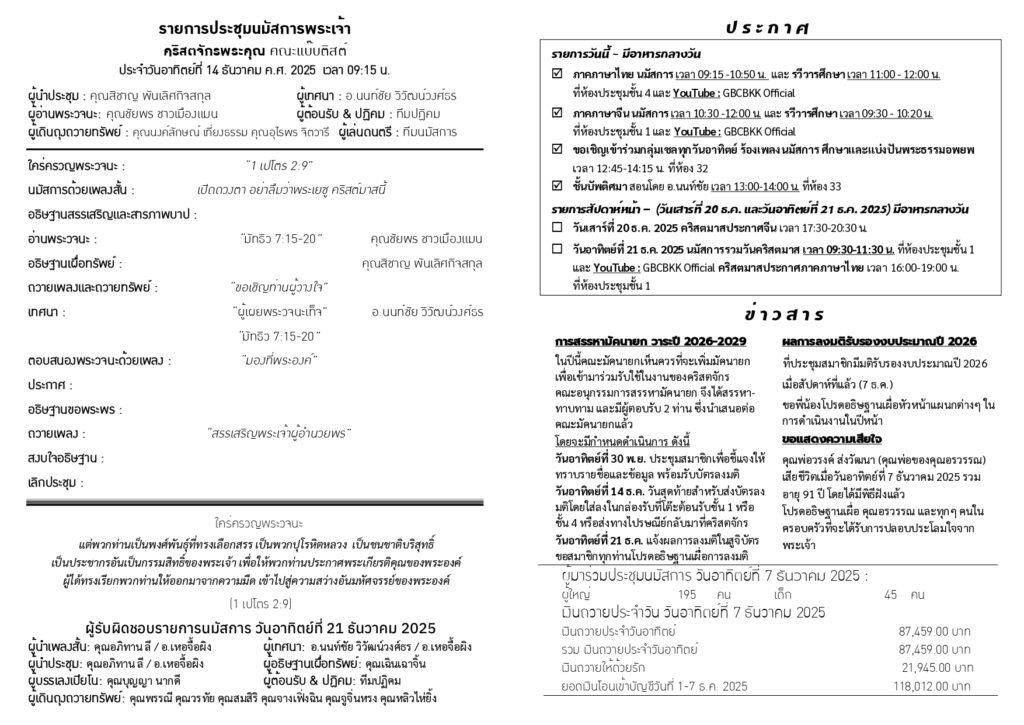 สูจิบัตร : ประชุมนมัสการ วันอาทิตย์ที่ 14 ธันวาคม ค.ศ. 2025