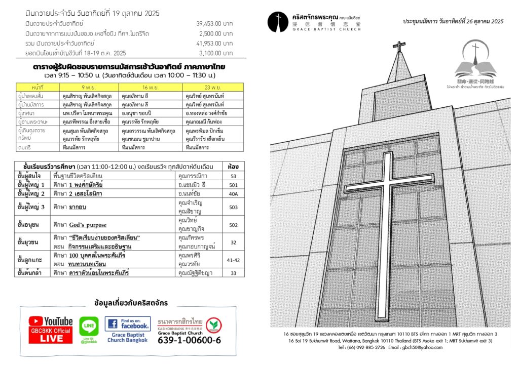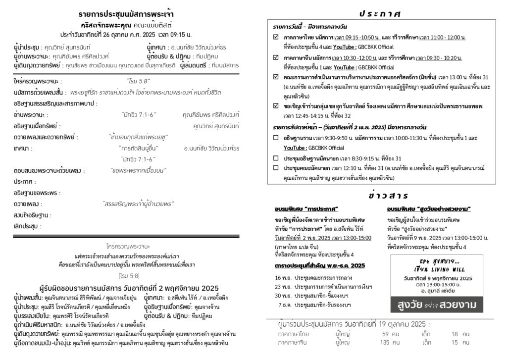 สูจิบัตร : ประชุมนมัสการ วันอาทิตย์ที่ 26 ตุลาคม ค.ศ. 2025