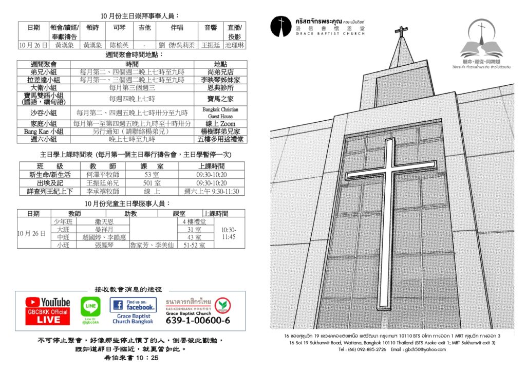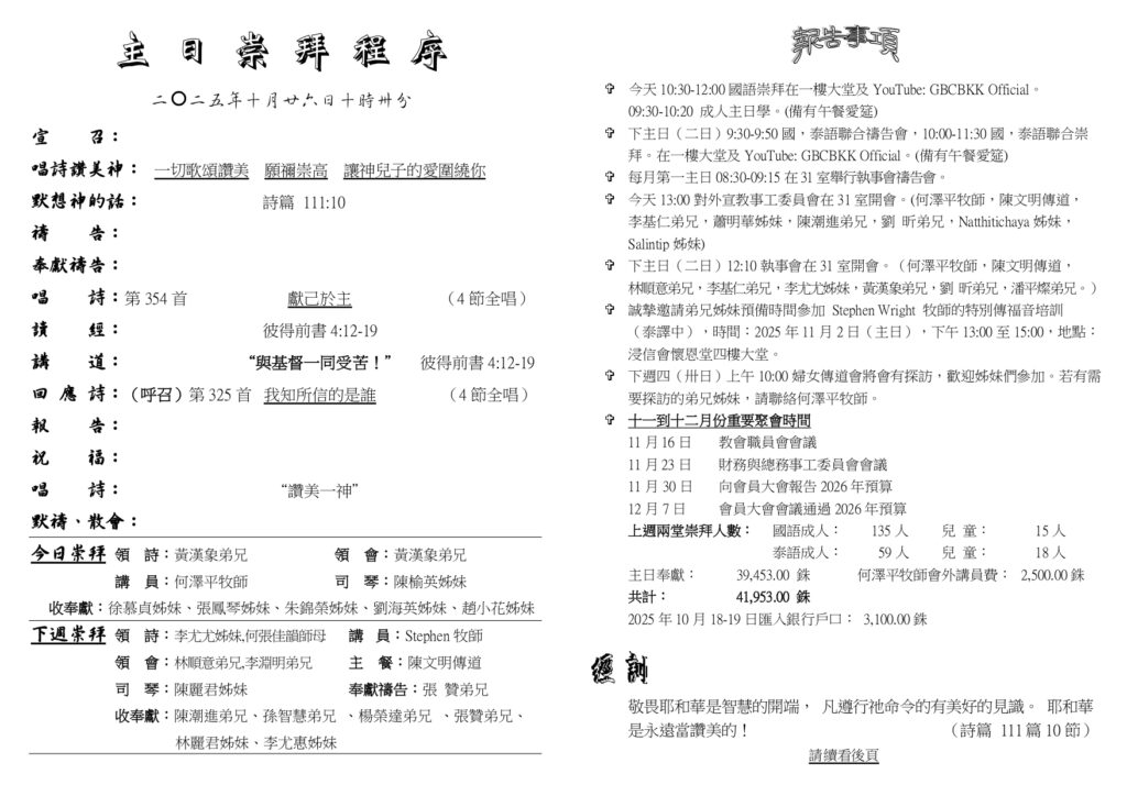 2025-10-25 0 สูจิบัตร 程序表國語部程序表 二〇二五年十月十九日 主日崇拜程序二〇二五年十月廿六日十時卅分 領 詩:黃漢象弟兄 領 會:黃漢象弟兄講 員:何澤平牧師 司 琴:陳榆英姊妹收奉獻:徐慕貞姊妹、張鳳琴姊妹、朱錦榮姊妹、劉海英姊妹、趙小花姊妹 宣 召: 唱詩讚美神:一切歌頌讚美 願禰崇高 讓神兒子的愛圍繞你默想神的話: 詩篇 111:10 禱 告:奉獻禱告: 唱 詩:第354首 獻己於主(4節全唱)讀 經:彼得前書4:12-19 講 道: “與基督一同受苦!” 彼得前書4:12-19回 應 詩:(呼召)第325首 我知所信的是誰(4節全唱)報 告:祝 福:唱 詩: “讚美一神”默禱、散會: Previous article2025年10月25日(六)經文:那鴻書1:1-15Next article วันอาทิตย์ที่ 26 ตุลาคม ฟีลิปปี 3:14 “การเดินทาง”