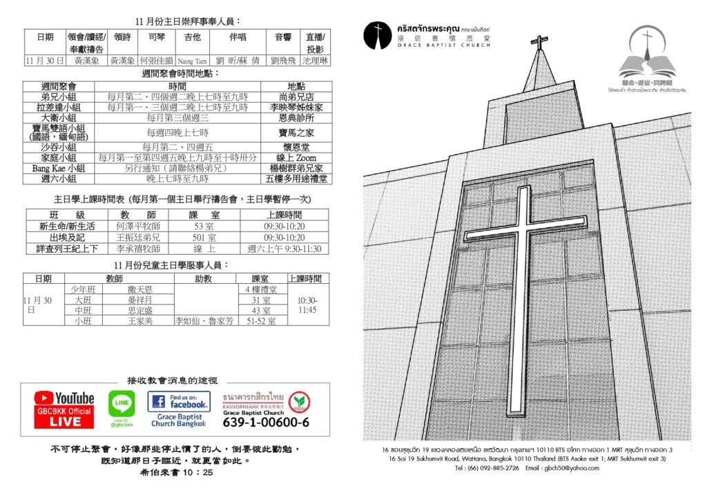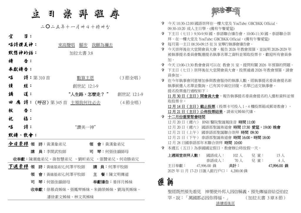 2025-11-29 0 สูจิบัตร 程序表國語部程序表 二〇二五年十一月卅日 主日崇拜程序二〇二五年十一月卅日十時卅分 領 詩:黃漢象弟兄 領 會:黃漢象弟兄講 員:李開武牧師 司 琴:何張佳韻師母收奉獻:陳潮進弟兄、孫智慧弟兄 、楊榮達弟兄 、張贊弟兄、何奇勝弟兄 宣 召: 唱詩讚美神:來高聲唱 腳步 我願為你去默想神的話:加拉太書3:8 禱 告:奉獻禱告: 唱 詩:第310首 數算主恩(3節全唱)讀 經:創世記 12:1-9 講 道: “人生路,怎麼走?” 創世記 12:1-9 回 應 詩:(呼召)第345首 主領我何往必去(4節全唱)報 告:祝 福:唱 詩: “讚美一神”默禱、散會: Previous articleวันเสาร์ที่ 29 พฤศจิกายน เนหะมีย์ 1:8-9 “คำอธิษฐานของเนหะมีย์ V”Next article 2025年11月30日(日)經文:但以理書16:1-33