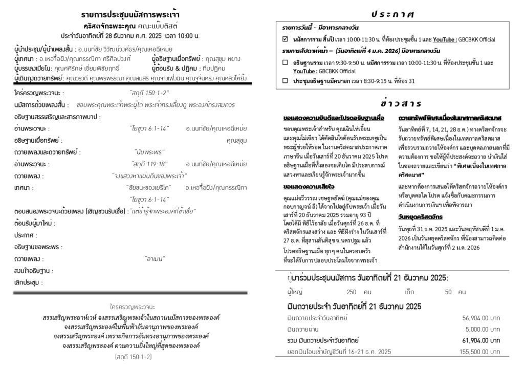สูจิบัตร : ประชุมนมัสการ วันอาทิตย์ที่ 28 ธันวาคม ค.ศ. 2025