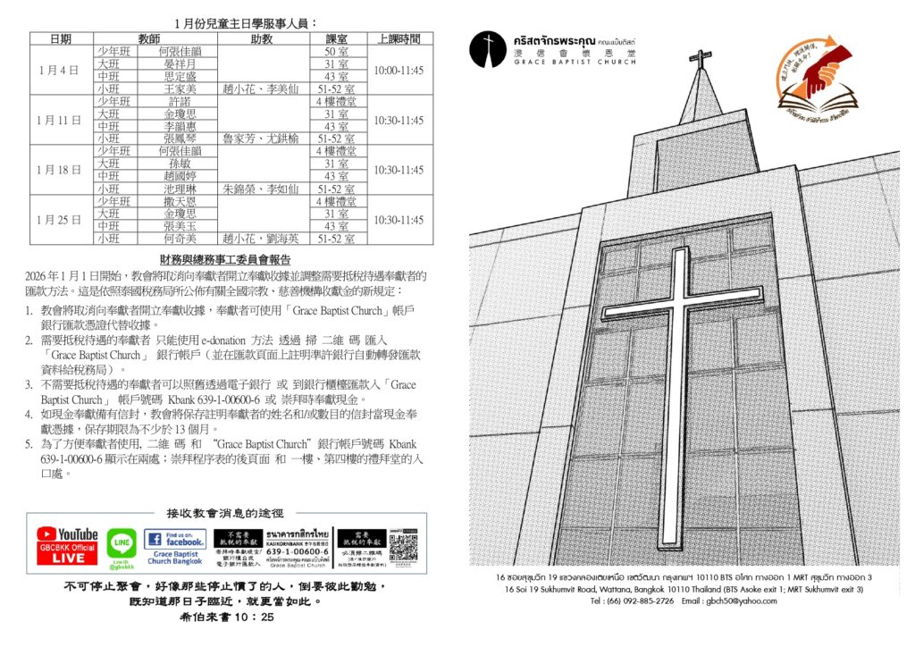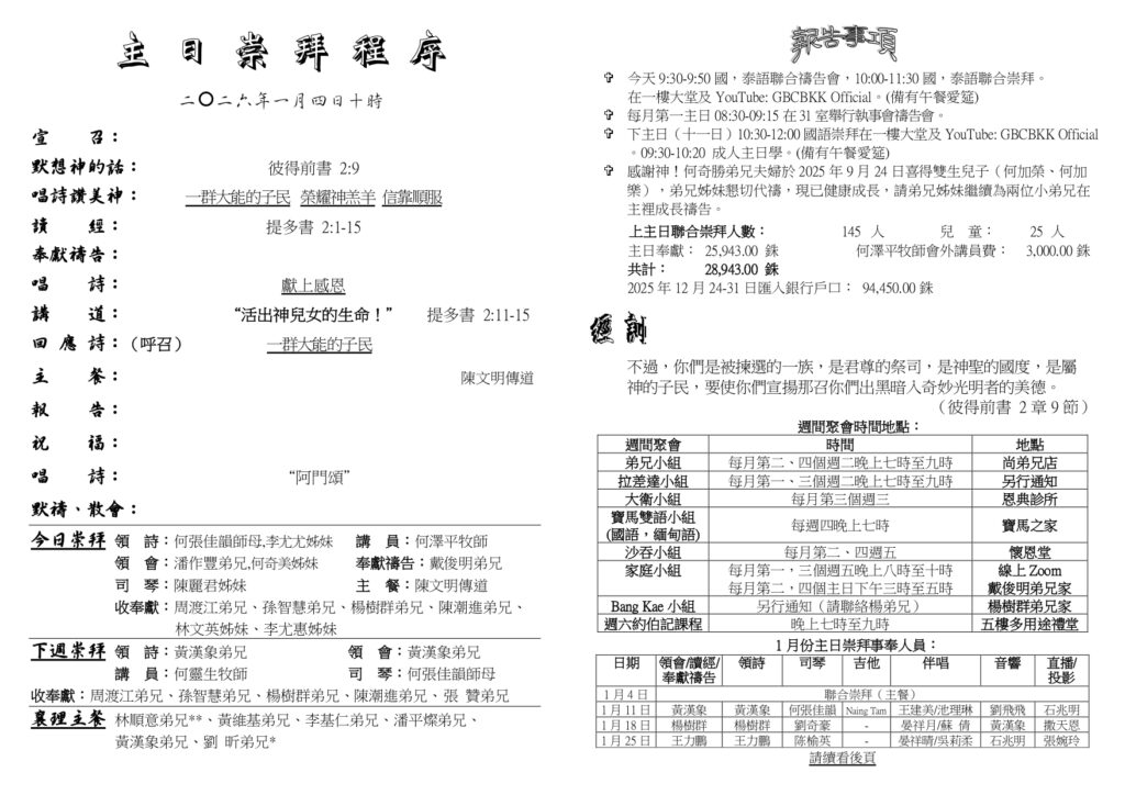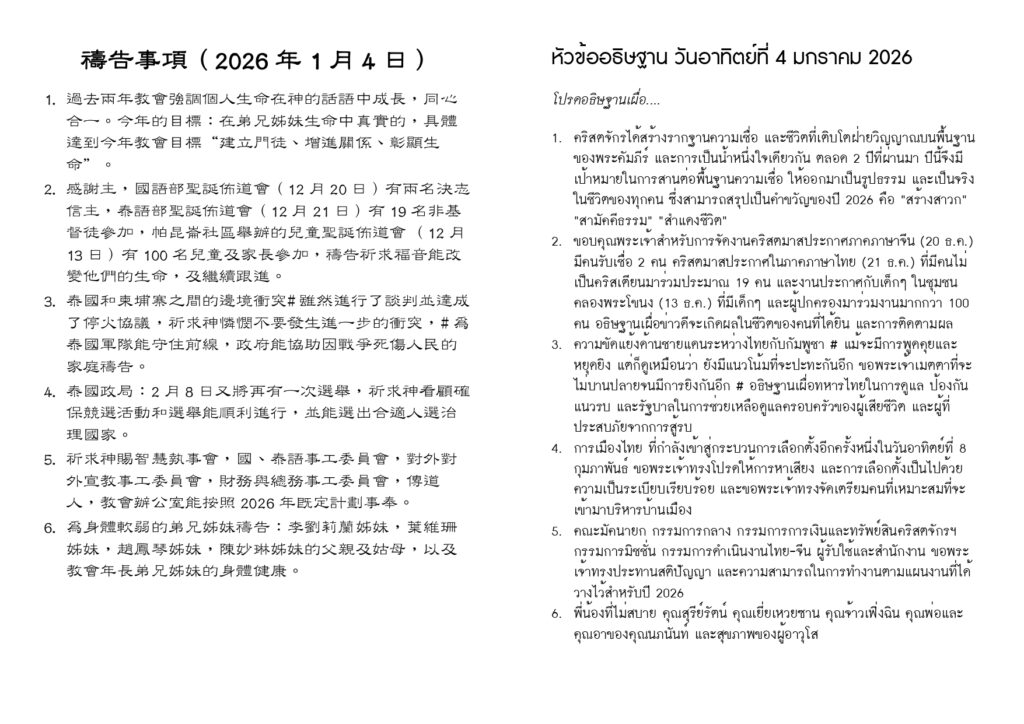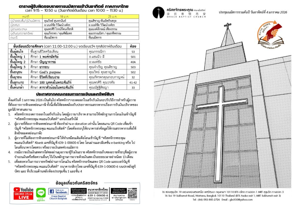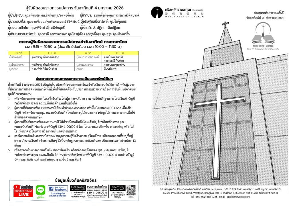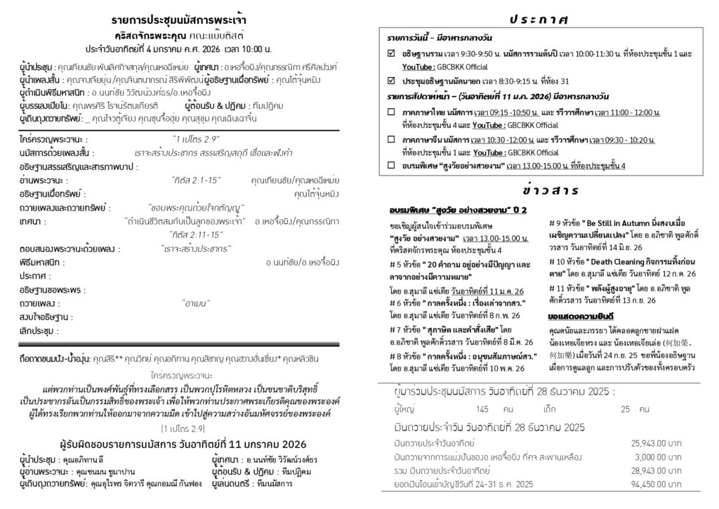 สูจิบัตร : ประชุมนมัสการ วันอาทิตย์ที่ 4 มกราคม ค.ศ. 2026